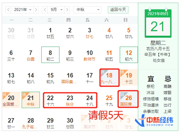 今年中秋假期的放假時間為9月19日至21日,9月18日(星期六)則要上班。3天時間適合短途旅行,如果在9月18日、9月22日至24日、9月26日(星期日上班)這5天請假,加上9月25日(星期六),就能拼出一個長達9天的假期。