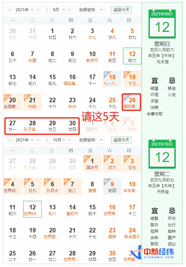 中新經緯客戶端9月13日電 (熊家麗)中秋、國慶兩節將至,一小一大兩個假期你準備怎麼安排?中新經緯客戶端發現,靈活請假可分別在兩節擁有“加長版”假期。