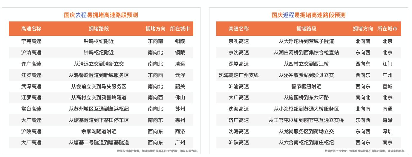 哪些路段易堵?報告顯示,去程易擁堵高速路段有寧蕪高速、滬渝高速、許廣高速、江羅高速、武深高速等;返程易擁堵高速路段有京禮高速、京沈高速、深岑高速、沈海高速廣州支線、滬渝高速等。