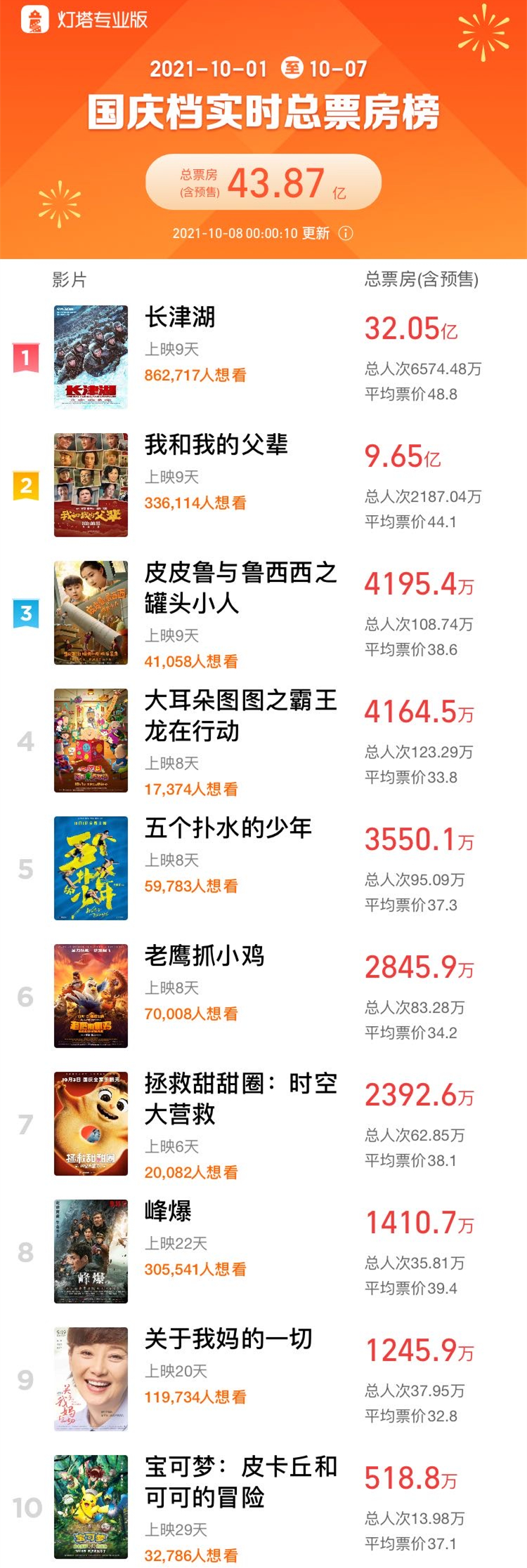 燈塔專業版數據顯示,國慶假期7天,《長津湖》票房超32.05億(上映以來累計票房34.1億),成國慶檔票房冠軍。《我和我的父輩》票房超9.65億(上映以來累計票房10.56億)、《皮皮魯與魯西西之罐頭小人》票房超4195萬(上映以來累計票房4535萬),分列國慶檔票房二、三名。