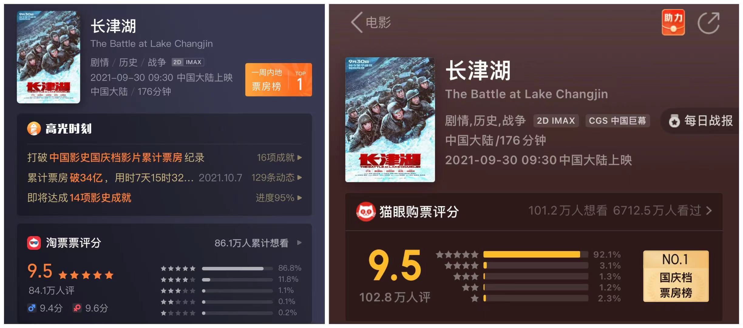 《長津湖》成今年國慶檔爆款,單部影片貢獻超七成的國慶檔票房。除了票房大賣,《長津湖》在燈塔專業版APP、貓眼專業版APP評分均為9.5分。