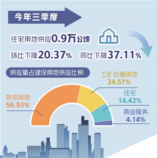 中國國土勘測規劃院新近發布的全國主要城市地價監測報告顯示,三季度住宅用地供應0.9萬公頃,環比下降20.37%,同比下降37.11%,住宅用地供應同比增速為2015年以來單季最低。