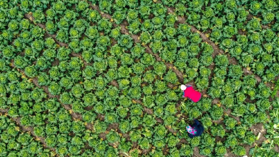 2021年11月4日,河北省唐山市豐南區王蘭莊鎮高先甸村的菜農在蔬菜基地收獲大白菜(無人機照片)。新華社發(劉滿倉攝)