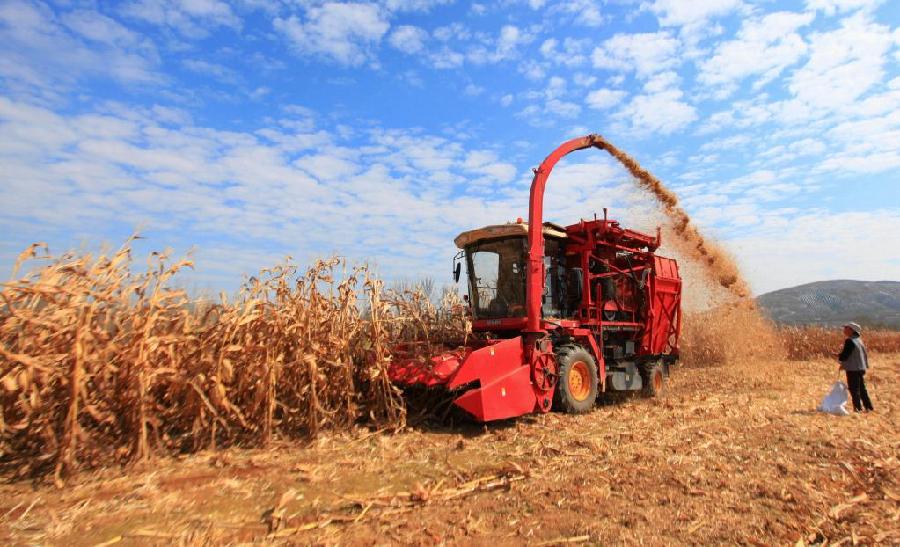2021年10月23日,農民駕駛收割機在山東省臨沂市平邑縣流峪鎮北申莊村田間收獲玉米。新華社發(武紀全 攝)