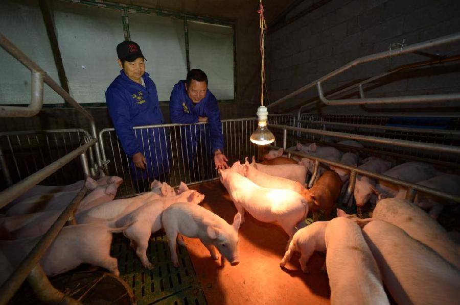 2021年11月3日,在貴州省黔南布依族苗族自治州羅甸縣邊陽鎮油海村養殖場,馬廷科(右)在查看生豬幼崽的生長情況。新華社記者 楊楹 攝