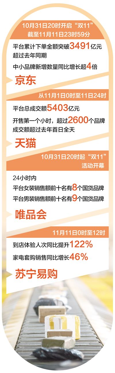 截至11月11日24時,天貓“雙11”總交易額達5403億元。在天貓,一批中小品牌銷量實現跨越式增長。11月1日0時起,至11月11日23時,已有698個去年成交額過百萬元的中小品牌,今年銷售額突破千萬元。
