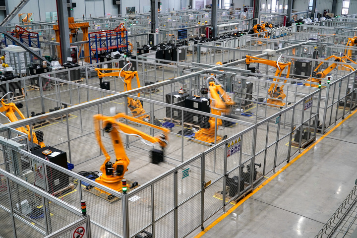 7月1日,在位于江蘇省南京市江寧區的南京埃斯頓自動化股份有限公司工業機器人生產車間,工業機器人在進行跑合測試。新華社記者 李博 攝