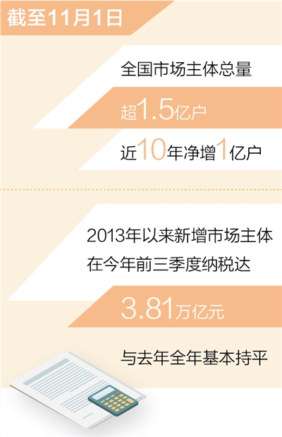 最新數據顯示,截至11月1日,全國市場主體總量超1.5億戶,近10年凈增1億戶。億萬市場主體的磅薄力量推動了我國經濟總量、國家財力和社會財富穩定增長,承載了7億多人就業的基本盤。