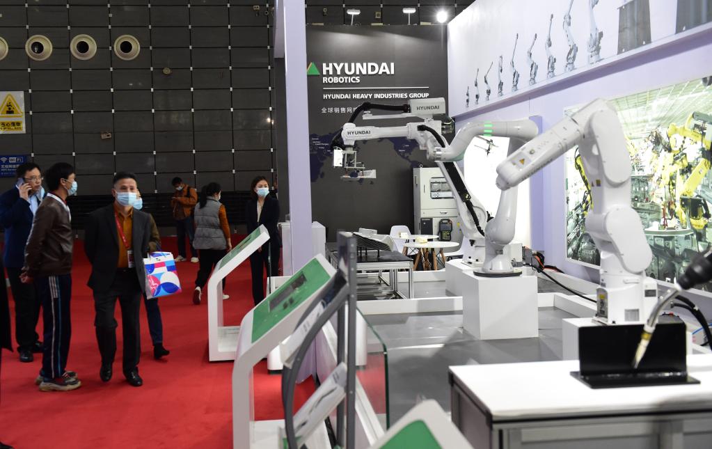 11月19日,觀眾在2021世界制造業大會上參觀展出的智能工業機器人。 新華社記者黃博涵 攝