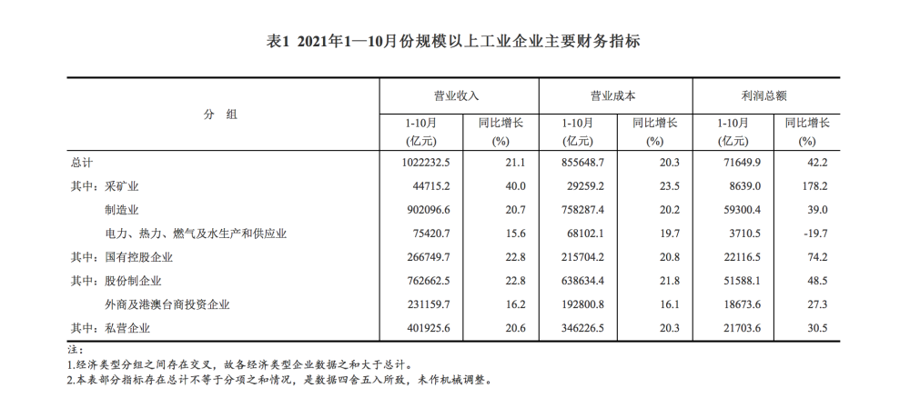 前10個月,規模以上工業企業實現營業收入102.22萬億元,同比增長21.1%;發生營業成本85.56萬億元,增長20.3%;營業收入利潤率為7.01%,同比提高1.04個百分點。