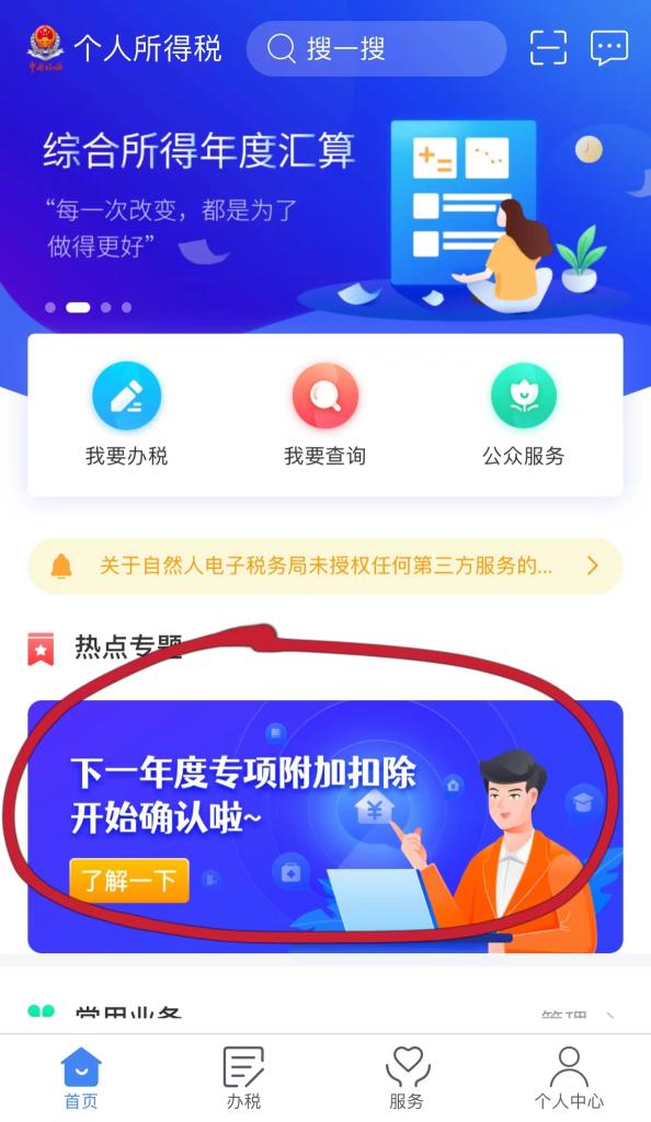 首先,進入個人所得稅APP內,首頁熱點專題找到下一年度專項附加扣除開始確認,點擊【了解一下】進入專項附加扣除頁面↓↓↓