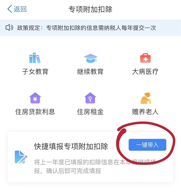 如為首次填報或有需要增加的項目,可在子女教育、繼續教育、大病醫療、住房貸款利息、住房租金、贍養老人中選擇填報;如沒有需要修改的信息,只需要在【快捷填報專項附加扣除】欄內選擇【一鍵帶入】↓↓↓
