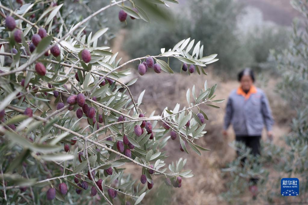 12月8日,在隴南市武都區兩水鎮後壩村一處油橄欖種植基地,農戶準備採摘油橄欖。