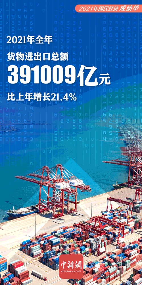 2021年中國外貿一路狂飆,全年貨物進出口總額391009億元,比上年增長21.4%。其中,出口217348億元,增長21.2%;進口173661億元,增長21.5%。