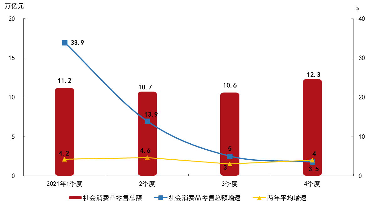 消費市場持續恢復。一季度,由于上年同期基數較低,社會消費品零售總額同比增長33.9%,兩年平均增速為4.2%;隨著疫情防控形勢不斷好轉,居民消費需求穩步釋放,剔除基數影響後,二季度市場銷售加快增長,兩年平均增速比一季度加快0.4個百分點;受部分地區疫情和極端天氣影響等因素衝擊,三季度兩年平均增速有所回落;四季度消費市場繼續恢復,社會消費品零售總額兩年平均增長4%,比三季度加快1個百分點。