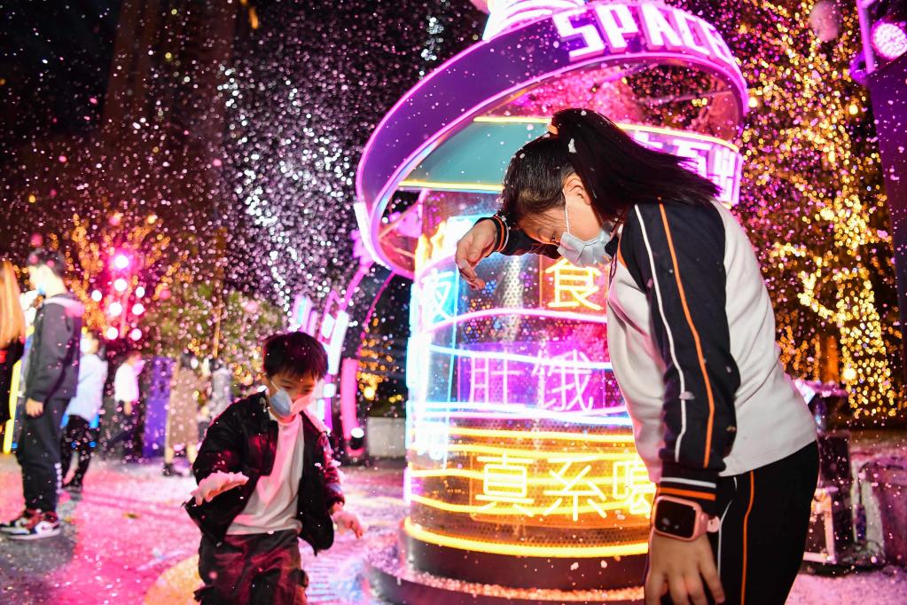 小朋友在廣州夜經濟集聚區天德廣場感受人工降雪(資料圖片)。新華社記者劉大偉攝