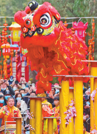 2月2日,人們在江蘇省無錫市惠山古鎮景區觀看梅花樁舞獅民俗表演。