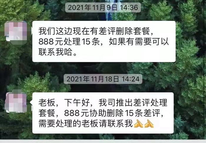 除了可以花錢刷好評,還可以付費刪差評。武漢一家餐廳經營者李先生告訴記者,開業不久就有機構找上門來,表示可以幫助刪除差評,“訂購888元套餐,可以幫助處理15條差評。”