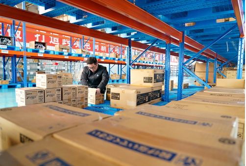 2019年12月20日,在唐山京唐港區保稅物流中心,跨境電商企業工作人員在整理貨物。新華社記者 楊世堯 攝