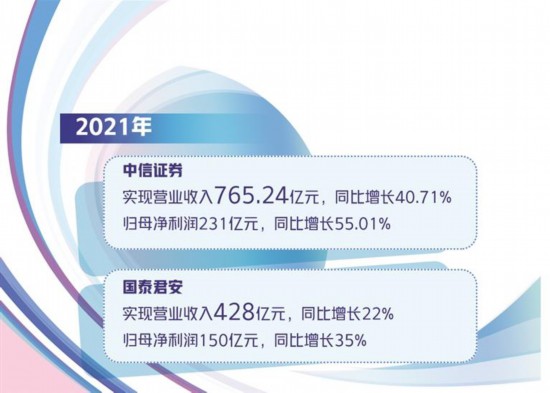2021年,中信證券實現營業收入765.24億元,同比增長40.71%;歸屬于母公司股東的凈利潤231億元,同比增長55.01%;無論是在投行業務還是資管規模上,中信證券仍然保持市場第一的位置。國泰君安全年實現營業收入428億元,同比增長22%;歸母凈利潤150億元,同比增長35%。