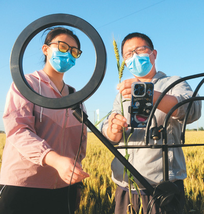 在山東省聊城市東昌府區閆寺街道周店村小麥良種繁育展示基地,負責技術的當地青年在對小麥品種進行直播推介。