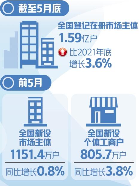 本報北京6月29日訊(記者佘穎)市場監管總局29日舉行的第二季度例行新聞發布會透露,截至5月底,全國登記在冊市場主體1.59億戶,比2021年底增長3.6%。其中企業5011.9萬戶、增長3.5%,個體工商戶1.07億戶、增長3.7%,農民專業合作社222.7萬戶、增長0.4%。今年前5月,全國新設市場主體1151.4萬戶,同比增長0.8%。