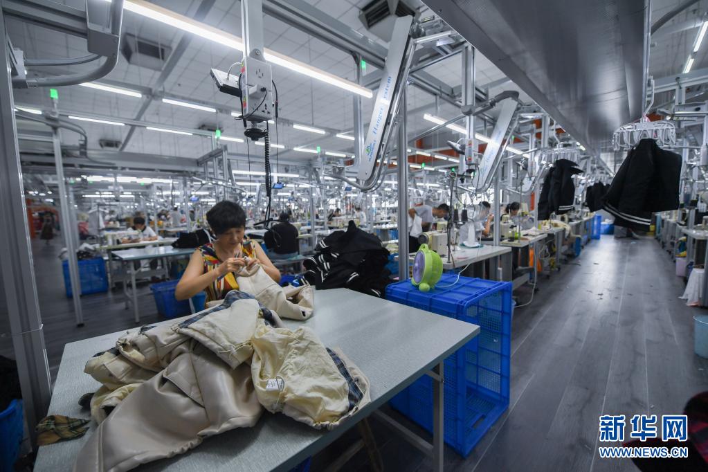 工作人員在位于浙江省湖州市織里鎮的湖州朗田服飾有限公司流水線上生產童裝(7月13日攝)。新華社記者 徐昱 攝