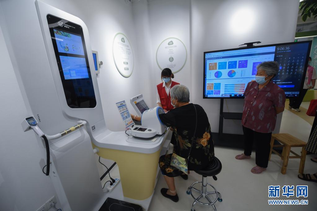 在浙江省嘉善縣姚莊鎮公眾健康體驗館,居民在志願者的幫助下測量身高、體重、體脂、血壓等身體指標(7月13日攝)。新華社記者 徐昱 攝