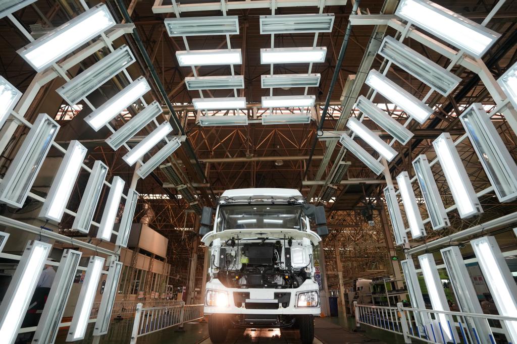 5月24日,在陜西汽車控股集團有限公司總裝車間,一輛裝配完畢的陜汽重型卡車等待驗收。2022年1至4月,這個企業出口訂單10167輛,同比增長42%。新華社記者 李一博 攝