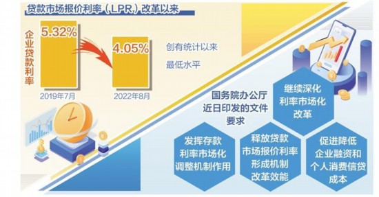 利率市場化改革是金融領域最重要的改革之一。近期,人民銀行在《深入推進利率市場化改革》一文中指出,黨的十九大以來,按照黨中央決策部署,人民銀行持續深化利率市場化改革。重點推進貸款市場報價利率改革,建立存款利率市場化調整機制,以改革的辦法推動實際貸款利率明顯下行。LPR改革以來,企業貸款利率從2019年7月的5.32%降至2022年8月的4.05%,創有統計以來最低水平。