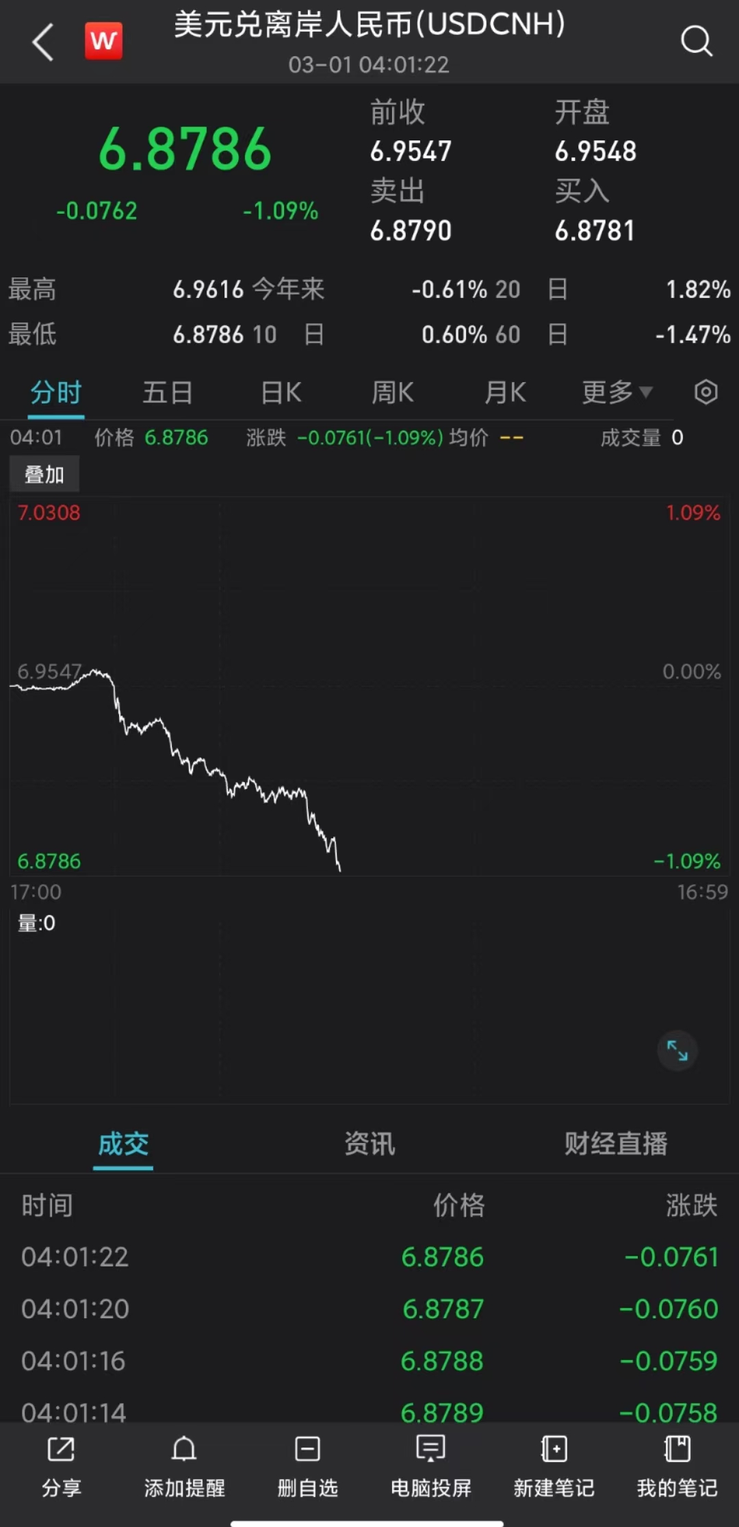 中新經緯3月1日電 3月1日,在岸、離岸人民幣雙雙大漲,均收復6.9關口。