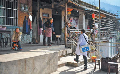 四川省北川羌族自治縣曲山鎮石椅村,村醫入戶走訪重點人群,提供醫療服務。新華社記者 張超群攝