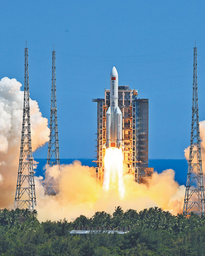 搭載問天實驗艙的長徵五號B遙三運載火箭,在海南文昌航天發射場點火發射。新華社記者 李 剛攝