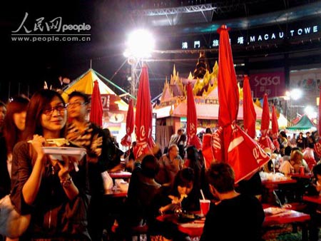 這屆美食節的口號也很響亮,“環球美食 盡在澳門”。走進美食街逛一圈,方知此言非虛:120多個中外攤位,分布在中式美食街、亞洲美食街、歐陸美食街、風味美食街及甜品街上,有萬豪軒等當地知名酒樓,也有來自吉隆坡、沙巴等地的商號。娘惹菜、馬來菜、印度菜及中國菜四大菜係一起亮相。食客可一邊品嘗美味,還可欣賞拉面表演,現場制作民間糖藝、面人及泥人。