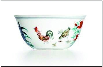 據了解,鬥彩工藝創燒于明代成化年間,用青花勾闊、五彩填色,有青花與彩瓷競艷之意。雞缸杯是明成化鬥彩杯之一,即飾子母雞圖之盛酒小杯,環繪公雞偕母雞領幼雛覓食。雞缸杯色彩繽紛鮮明,撫之柔潤如玉,繪畫更率真可人。成化雞缸杯曾于1980年及1999年拍賣,均刷新中國瓷器世界拍賣紀錄。香港蘇富比稱,除本拍品外,存世的雞缸杯僅有三件為私人收藏。