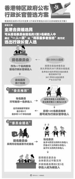 香港特區政府22日發表《行政長官普選辦法公眾咨詢報告及方案》。根據方案,全港合資格選民可從提名委員會提名的2至3名候選人中,通過“一人一票”以“得票最多者當選”的方式選出行政長官人選。