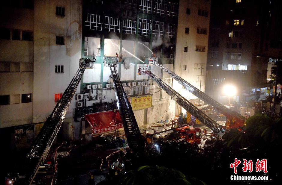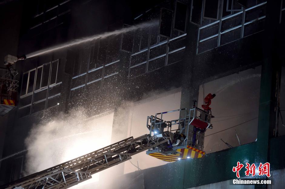 6月24日淩晨1時,香港九龍淘大工業村一迷你倉庫火災現場。本次火災焚燒超過60小時仍未撲滅,已有兩名消防員在火災中殉職。