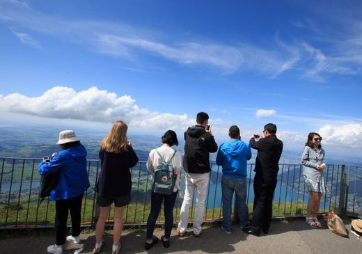 圖說:8月1日,幾名中國遊客(中右)在瑞士里吉山頂峰欣賞美景。里吉山素有阿爾卑斯“山巒皇後”的美譽。 新華社記者徐金泉攝