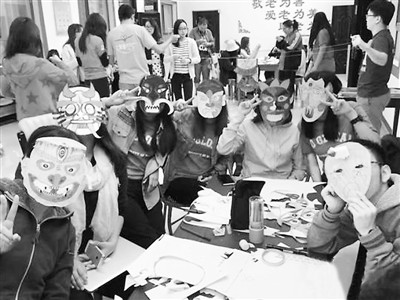 圖為大學生與當地兒童一起制作藏族面具。 李雷雷攝