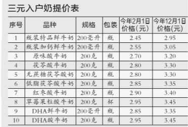 今年2月1日起,三元入戶牛奶已全面提價一次,當時最高提價幅度達到17%。