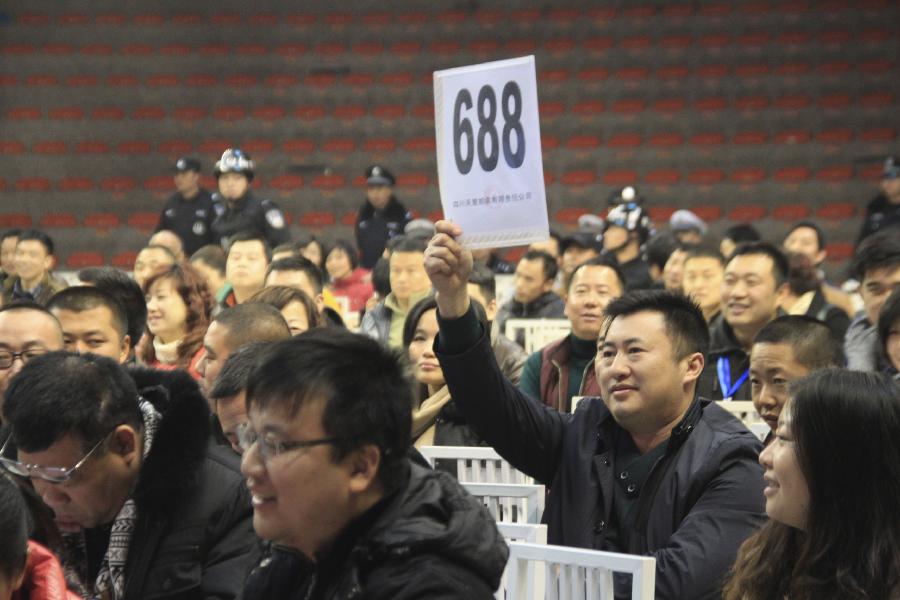 新華社照片,宜賓(四川),2014年1月14日 五糧液集團公務車拍賣結束 成交額超3000萬元 1月14日,競拍者在舉牌競拍五糧液公務用車。當日,為期4天的五糧液集團公務車拍賣活動結束,拍賣共成交車輛324臺,成交額3003萬元。1月11日,五糧液開始公開拍賣公務用車,被拍賣的公車包括悍馬、沃爾沃、奧迪等豪華車。新華社發(易友波)