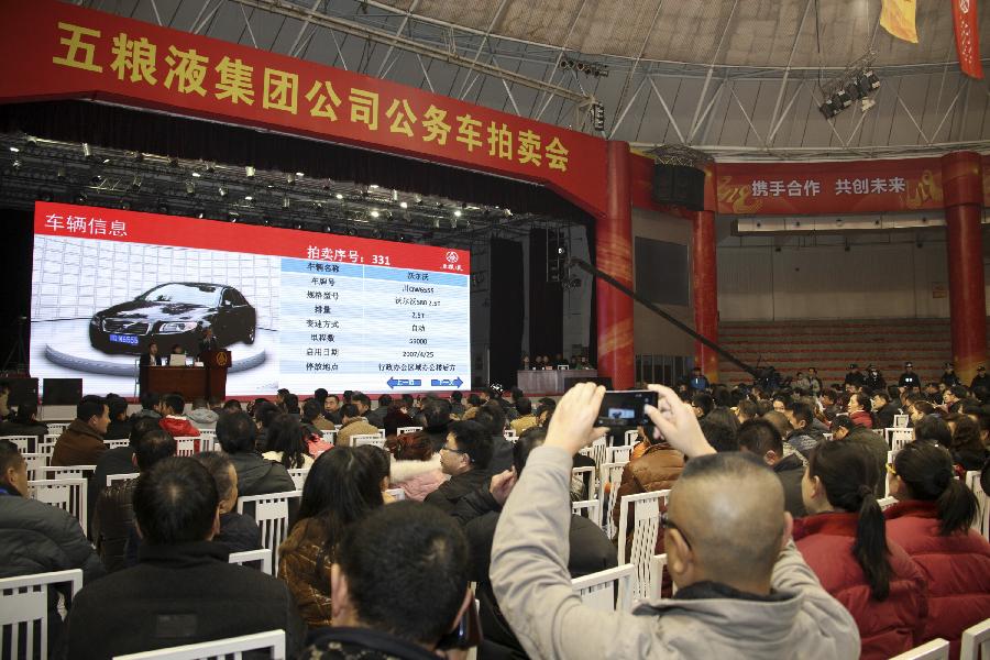新華社照片,宜賓(四川),2014年1月14日 五糧液集團公務車拍賣結束 成交額超3000萬元 1月14日,競拍者參加五糧液公務車拍賣會。當日,為期4天的五糧液集團公務車拍賣活動結束,拍賣共成交車輛324臺,成交額3003萬元。1月11日,五糧液開始公開拍賣公務用車,被拍賣的公車包括悍馬、沃爾沃、奧迪等豪華車。新華社發(曾朗)