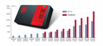 此前,東阿阿膠已進行過多輪提價。2011年,東阿阿膠旗下阿膠塊一次性提價60%,2012年累計提價50%。2013年初再次提價6%,隨後的7月,公司再次宣布淡季提價25%。本次提價後,東阿阿膠塊的出廠價達到1650元/公斤,比2010年初的每公斤432元上漲了2.8倍。