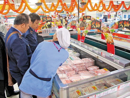 珠海市工商局派出的人員正在超市中對售賣的肥羊卷進行抽樣