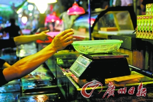 記者觀察多個檔口發現,在實際買單時,雖然所有的老板都說著為顧客算“去皮”後的價錢,但並沒有嚴格地將袋子的重量去皮後稱重。在某家檔口,記者見到了一位市民正在結賬。“68元一斤,總共是78.5元,去皮後你給我78元就成了。”老板拿著計算器算完後告訴市民。不細心的顧客往往覺得去皮沒有必要那麼仔細,總價去掉零頭便可以了。
