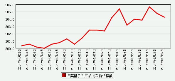 農業部5月16日公布“全國農產品批發市場信息網”監測報告。報告顯示5月16日,農產品批發價格總指數是202.8(以2000 年為100),“菜籃子”產品批發價格指數是204.3(以2000年為100)。