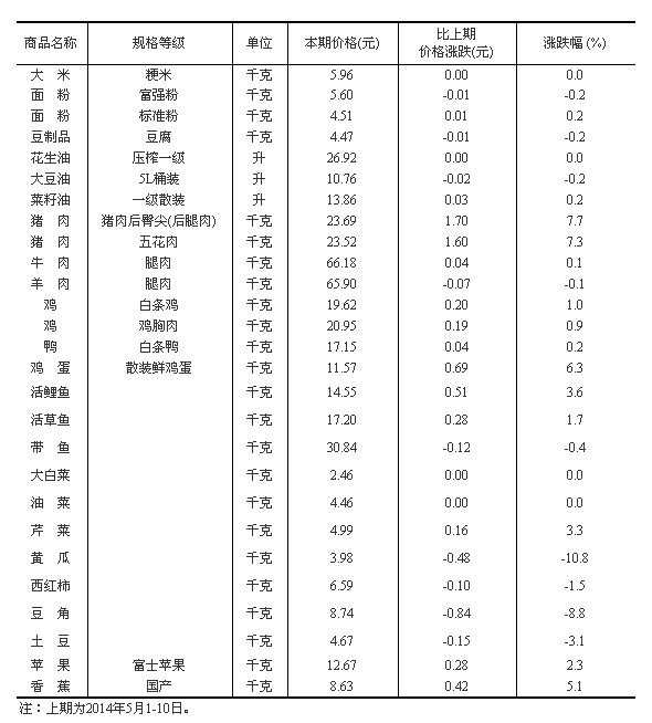 新華食品5月27日電 國家統計局昨日發布全國50個城市主要食品平均價格變動情況(2014年5月11-20日)。