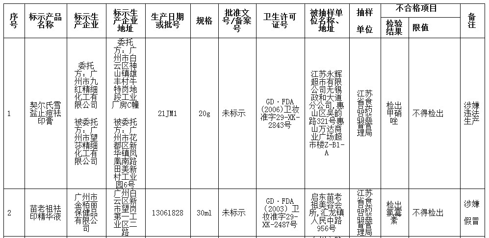 新華食品6月25日電 國家食品藥品監督管理總局(以下簡稱:食藥監總局)24日公布了對宣稱祛痘/抗粉刺和美白/祛斑類化妝品的國家監督抽檢結果,6批產品檢出禁用物質。其中,其中,契爾氏雪鹽止痘祛印膏、苗老祖祛印精華液、苗老祖祛印精華液、白天使小菁清痘王、龍醫生痤瘡露均檢出禁用物質“甲硝唑”;龍醫生痤瘡露、草本祛痘益膚霜檢出禁用物質“氯霉素”。(不合格名單詳見附件)