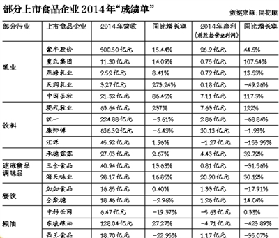 近期,上市食品企業陸續披露了2014年度財務報告。食品市場上的風起雲涌、此消彼長,定格成一堆嚴肅且不容樂觀的業績數字。