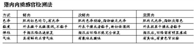此外,食品安全專家表示,在自然光線下,觀察肉的表面色澤、用手按壓豬肉表面等感官檢測也能對豬肉肉質有所判斷,具體方式見下表。